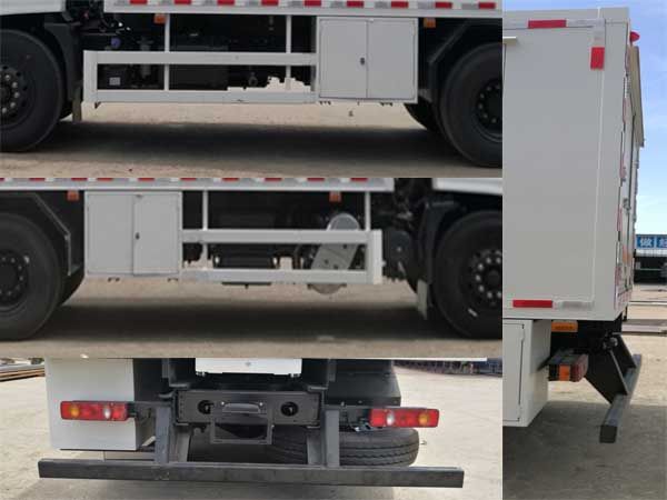 | 整车说明: | 车厢顶部封闭,不可开启。侧防护和后防护采用材料材质Q235A,侧防护连接方式为焊接,后防护连接方式为螺栓连接,后防护断面尺寸120×60mm、离地高度480mm。ABS型号/生产厂家:3631010-C2000/东科克诺尔商用车制动系统(十堰)有限公司,ABS 8/东科克诺尔商用车制动系统(十堰)有限公司, 4460046450/威伯科汽车控制系统(中国)有限公司;D6.7NS6B230,B6.2NS6B210,B6.2NS6B230,DDi50E190-60,D4.5NS6B190,DDi50E220-60发动机最大净功率分别为166kW,151kW,166kW,143kW,135kW,158kw.专用装置:摆臂式液压升降抑尘喷洒杆、储液罐、控制系统、水泵,主要用于铁路煤炭运输煤扬尘污染防治,用于铁路抑尘。 | ||